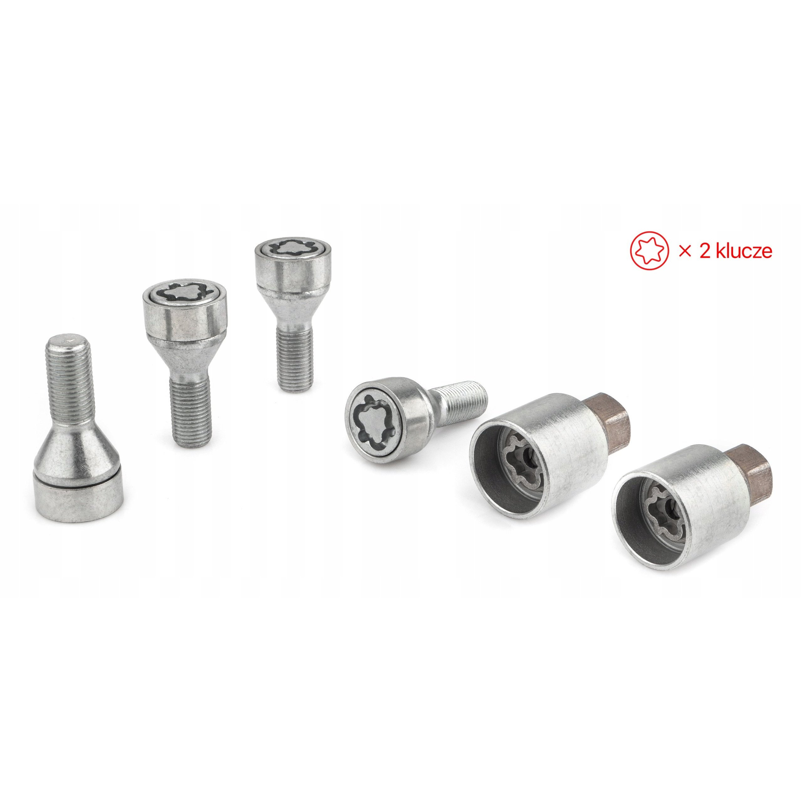 The set consists of 4 security bolts and 2 keys with an exclusive groove pattern. The hardened head cannot be unscrewed without the correct key. The heat-treated metal of the bolts is resistant to shearing/breaking attempts, and the reinforced additional rotating sleeve and low position of the bolt inside the rim prevent theft using improvised tools (spanner/adjustable spanner, pliers, etc.).