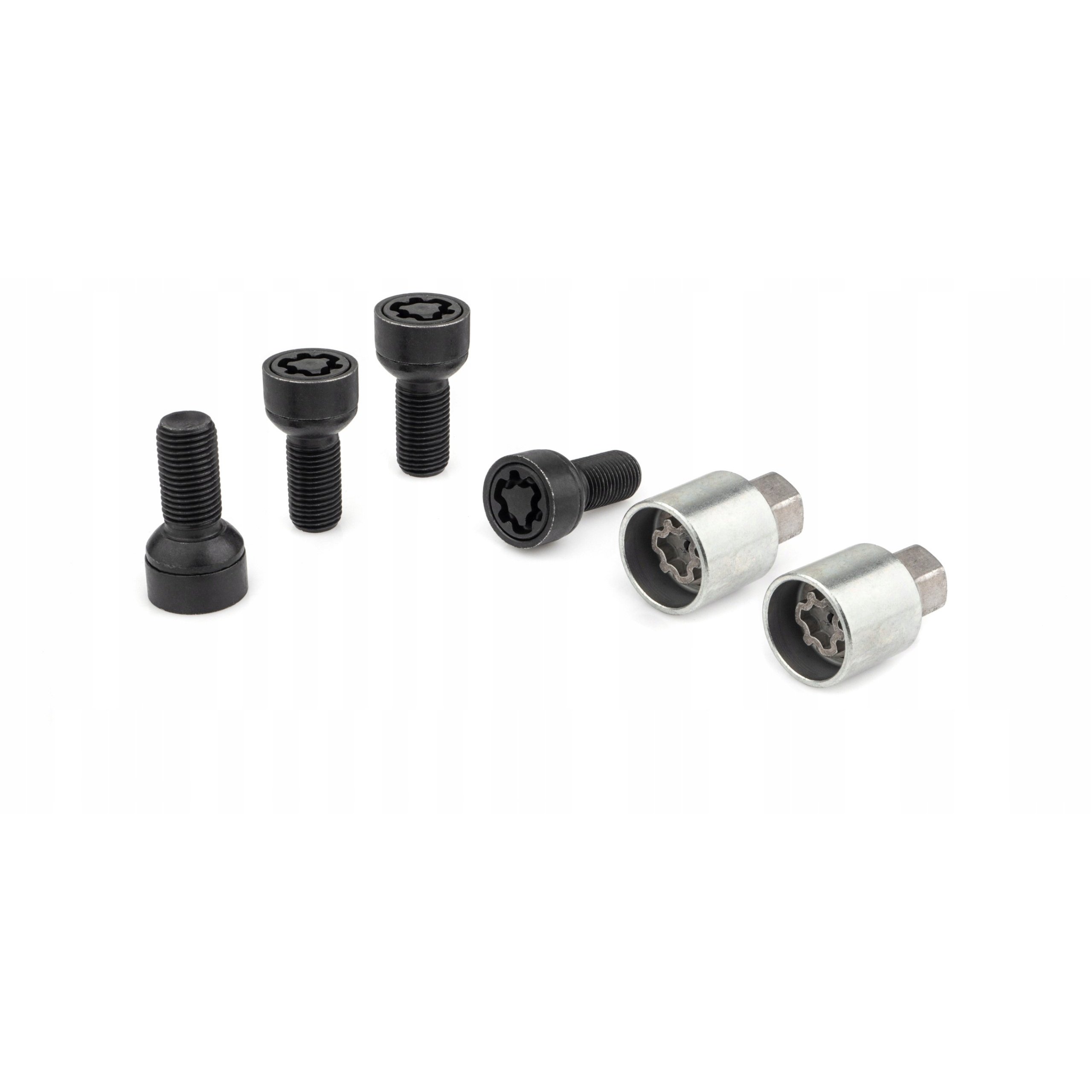 The set consists of 4 security bolts and 2 keys with an exclusive groove pattern. The hardened head cannot be unscrewed without the appropriate key. The heat-treated metal of the bolts is resistant to shearing/breaking attempts, and the reinforced additional rotating sleeve and low position of the bolt inside the rim prevent theft with improvised tools (wrench/adjustable wrench, pliers, etc.).
